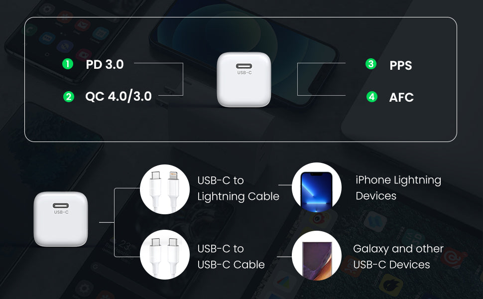 - You can use an extra USB C to C cable(Not included) or USB C to Lightning cable(Not included) working with this USB-C wall charger.