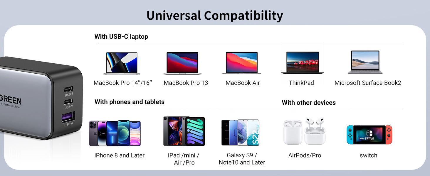 Single-Port | USB-C1/C2: 5V/3A 9V/3A 12V/3A 15V/3A 20V/3.25A 65W Max PPS:3.3-21V/3AUSB-A: 4.5V/5A 5V/4.5A 5V/3A 9V/2A 12V/1.5A 22.5W Max |