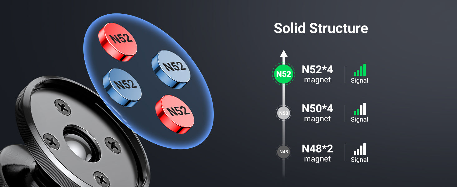 Built-in 4 magnets producing circulated magnetic field, UGREEN magnetic phone holder designed with ultra reinforce magnetic to adsorption with your phone. No more worry about dropping off.