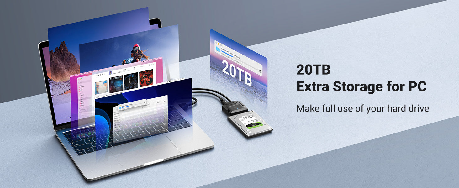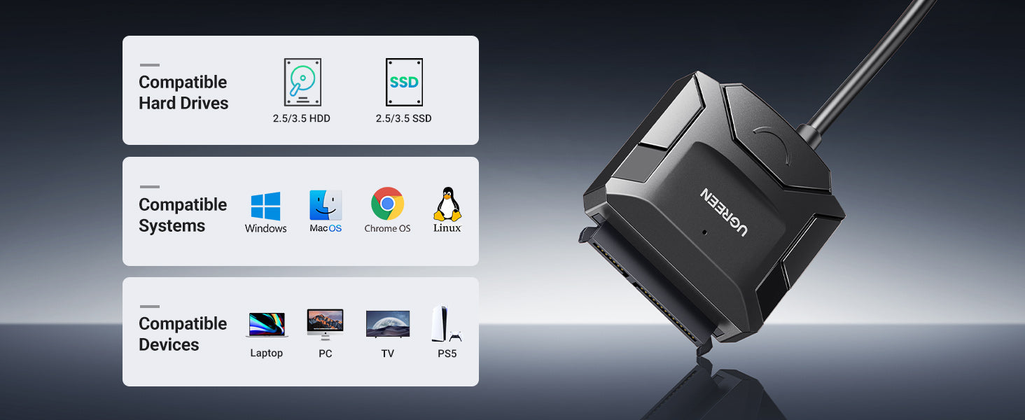 UGREEN USB 3.0 to SATA III Adapter cable enables quick access to 2.5/3.5 inch SSD and HDD, and offers an easy way for booting up old hard disks, upgrading PC storage, cloning hard disks, recovering & retrieving data of decommissioned laptops, and expanding storage. You are free of opening a computer panel for troublesome installation. More effective and convenient.