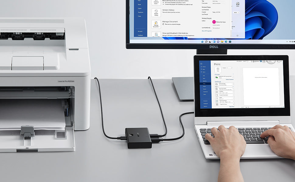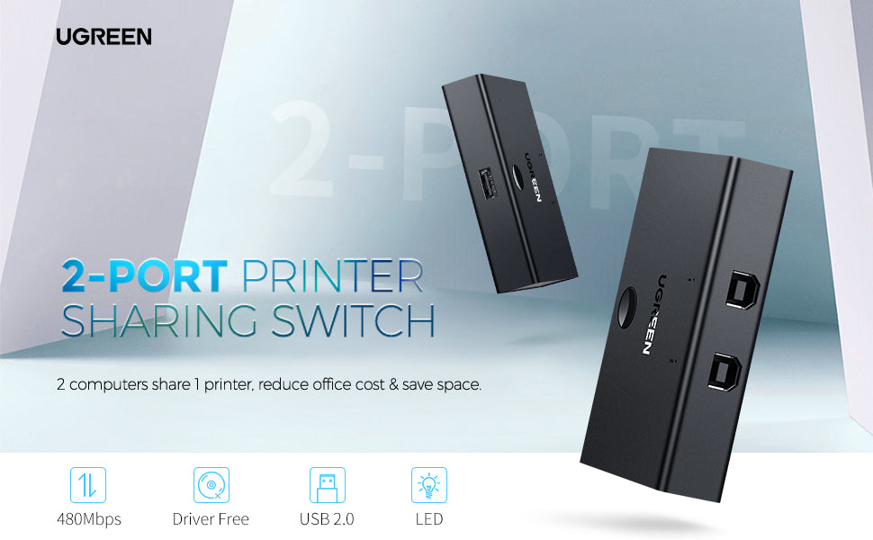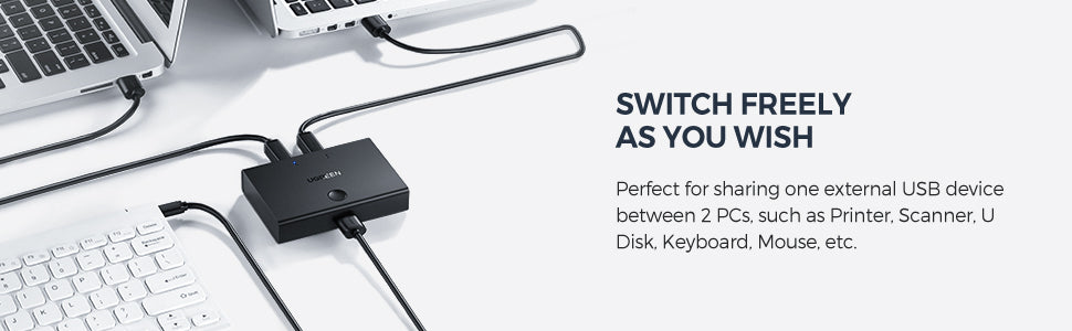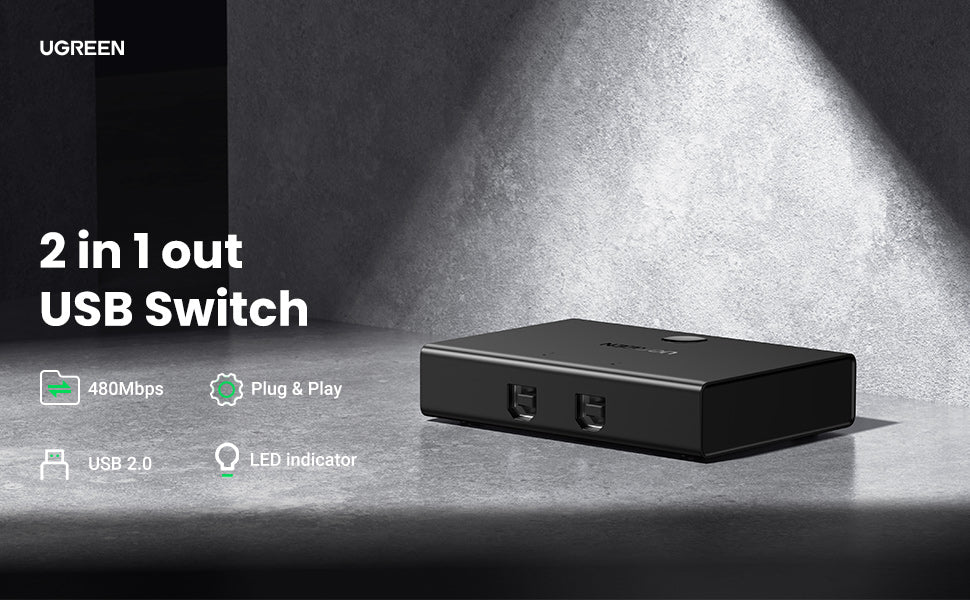 Switch Freely with UGREEN 2-Port USB Switcher Box, Share Resources and Save Money & Time! USB Switcher with One-push-button Control Ugreen 2 in 1 out USB 2.0 sharing switch is ideal for enabling 2 computers to share 1 USB device. Simply press the switch button to change the controlling computer. Relief from the endless disconnect and reconnect as well as tangled USB cable mess. Simplify using experience and tidy up your desk. Wide Compatibility The USB sharing box allows 2 PCs to share 1 USB device, for example, a printer, scanner, camera, keyboard, and any other devices with USB connection. Also fully compatible with all computers equipped with standard USB 3.0/2.0/1.1 Type-A interface, no matter the system they run, such as Macbook, MacBook Pro, iMac, Surface Pro, Windows 10 / 8.1 / 8 / 7 / XP / Vista, Linux. LED Indicator & Compact Design LED indicator lights allow you to know which computer is in control easily. Designed to be compact and lightweight, the USB KM switch takes very little space. It's a great companion for you either in working office or while on-the-go. Warm Reminder Not bidirectional, only works as 2 in 1 out. Wear resistant, good heat dissipation Adopt ABS, PVC material, anti-oxidation, high-temperature resistance, expand the lifespan of USB switch.