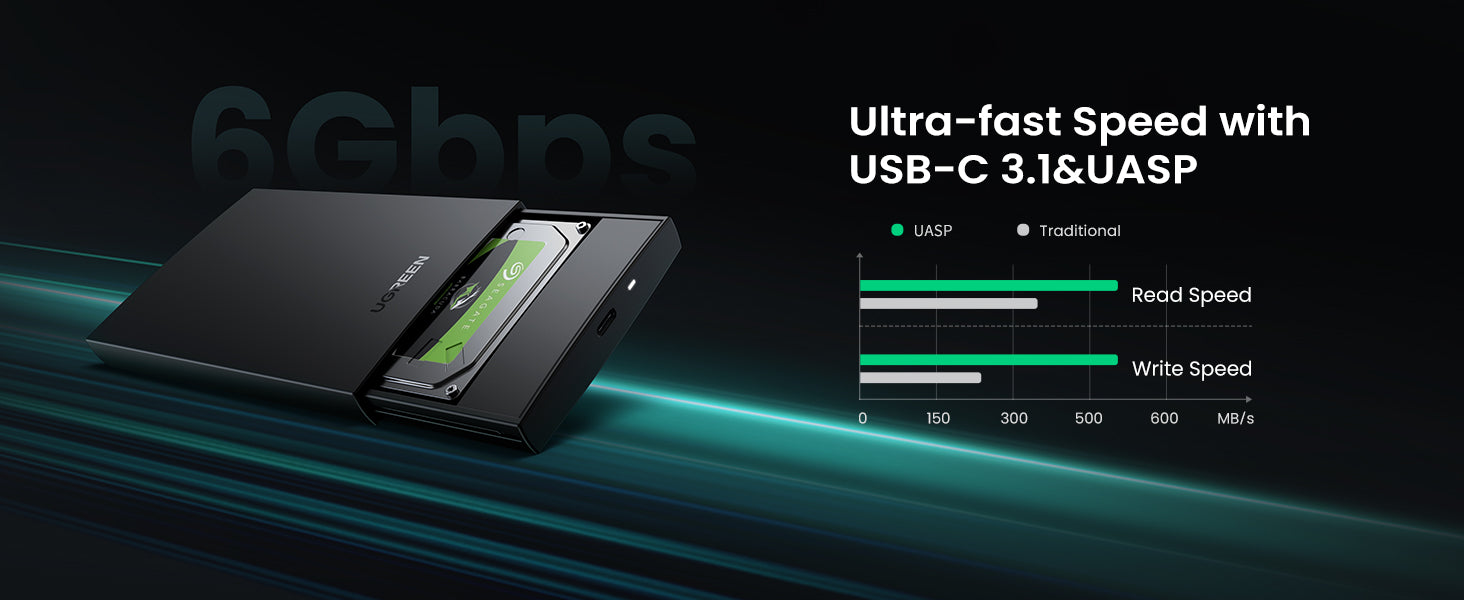 The USB C Hard Drive Enclosure supports 6Gbps max transfer speed and UASP accelerated transmission protocol, 70% Faster than traditional USB 3.0. The USB-C port is standard USB 3.1 Gen 2 which supports 10Gbps and (7+15)Pin SATA III supports max 6Gbps.
