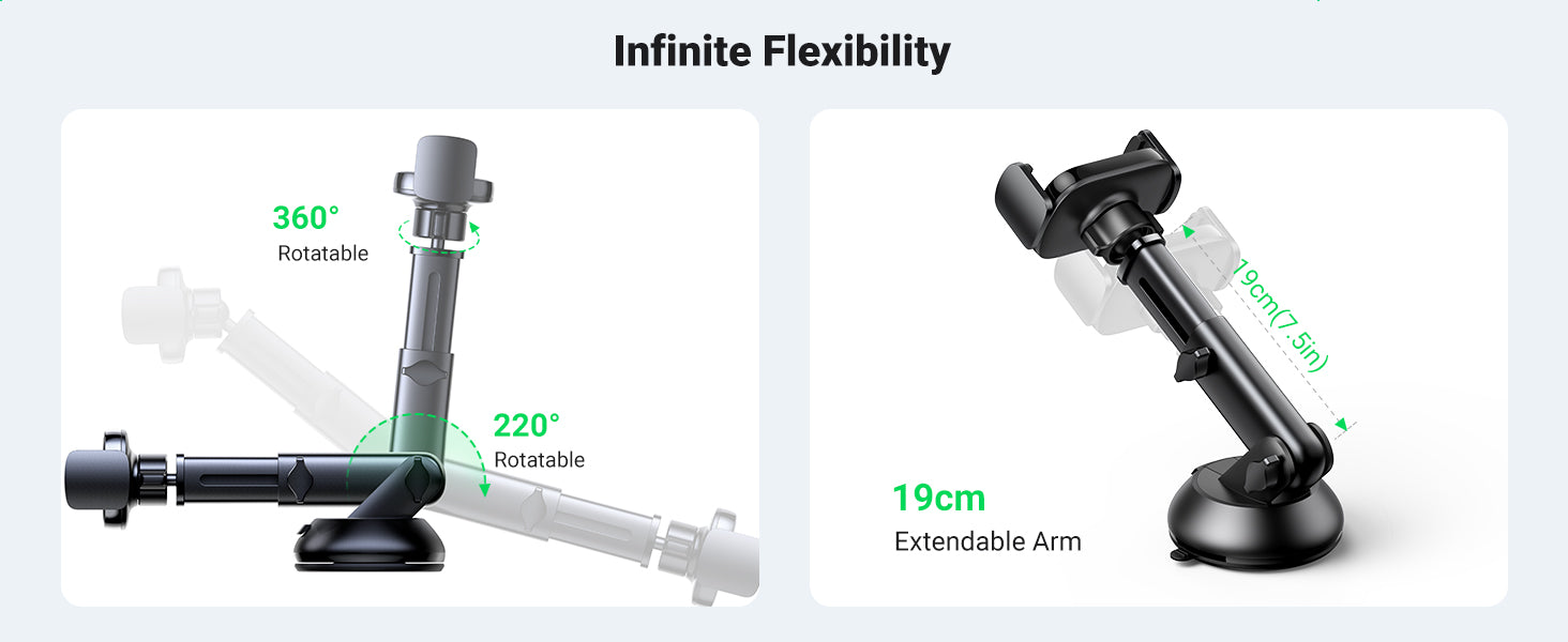 Featuring a 220° adjustable long arm and rotatable joint, adjust the holder for optimal view, no matter vertical & horizontal position