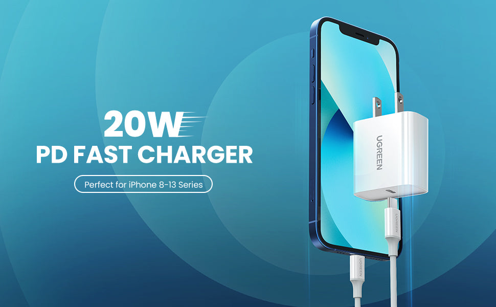 UGREEN USB C PD charger features the Type-c port with Power Delivery 3.0, It can fast charge for your PD compatible devices. Your iPhone 13 can be charged from 0% to 58% in just 30 minutes.