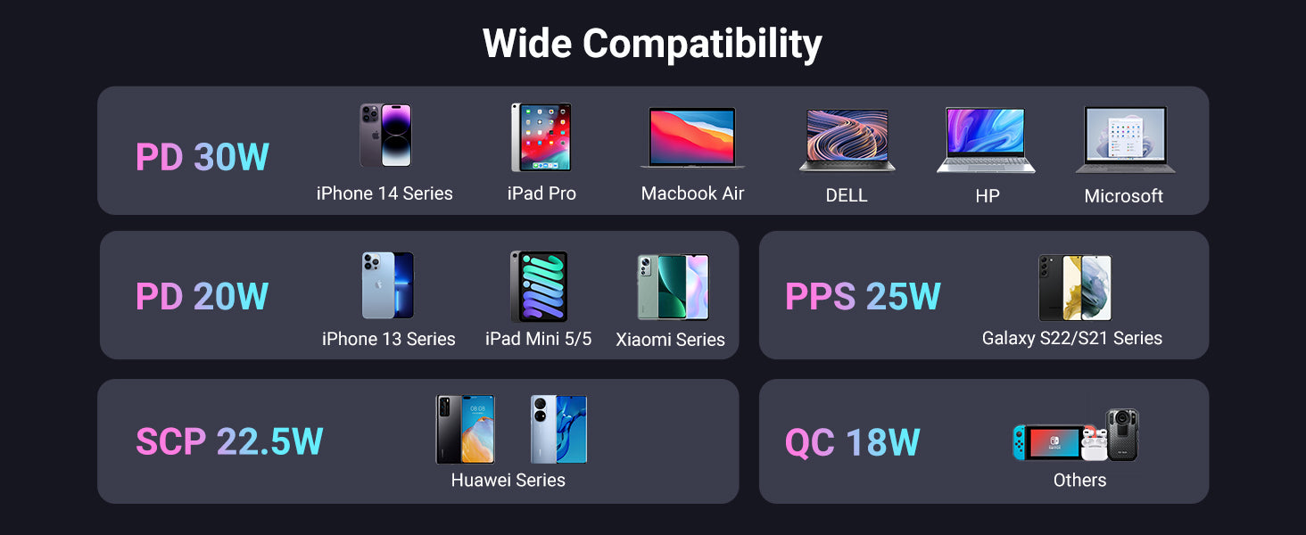- PD 30W & SCP 22.5W / QC 18W Fast Charging