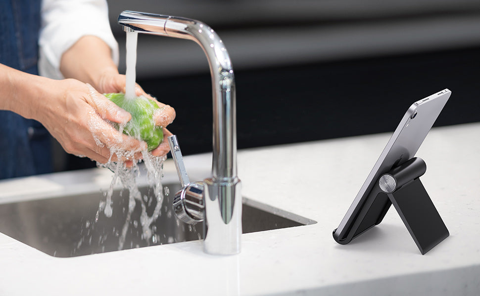 The desk phone stand can keep your phone safe from being splashed with water when working around water at the sink.