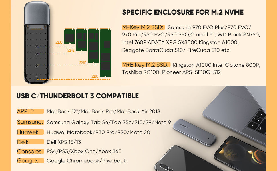 M-Key M.2 SSD: Compatible with Samsung 970 EVO Plus 250GB/500GB/1TB, Samsung 970 EVO 250GB/500GB/1TB/2TB, Samsung 970 Pro, Samsung 960 EVO, Samsung 950 PRO, Crucial P1 500GB/1TB, WD Black SN750 250GB/500GB/1TB/2TB, WD Blue SN500 2280, Intel 760P Series, ADATA XPG SX8000/XPG SX8200, CORSAIR Force Series, Plextor M8Pe, Plextor M9Pe, HP EX900, Kingston A1000, PNY CS2030,Seagate BarraCuda 510/ FireCuda 510, SANDISK EXTREME PRO 3D SSD 500GB/1GB;