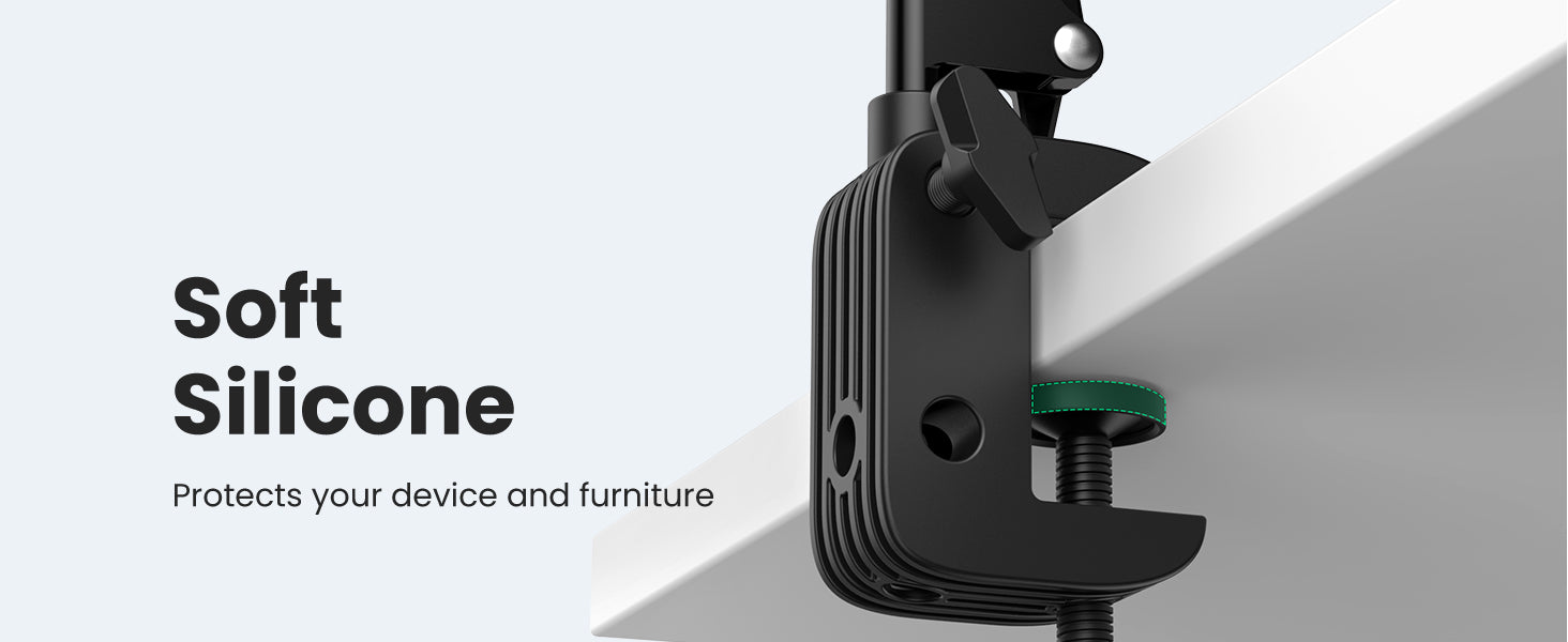 Soft rubber pad on the base clip won't make any damage to your wooden or glass desk. The adjustable base clip of this ipad holder could firmly clamp the chair, tablet, desk, wall cabinet, and bed headboard of Max 2-inch thickness.