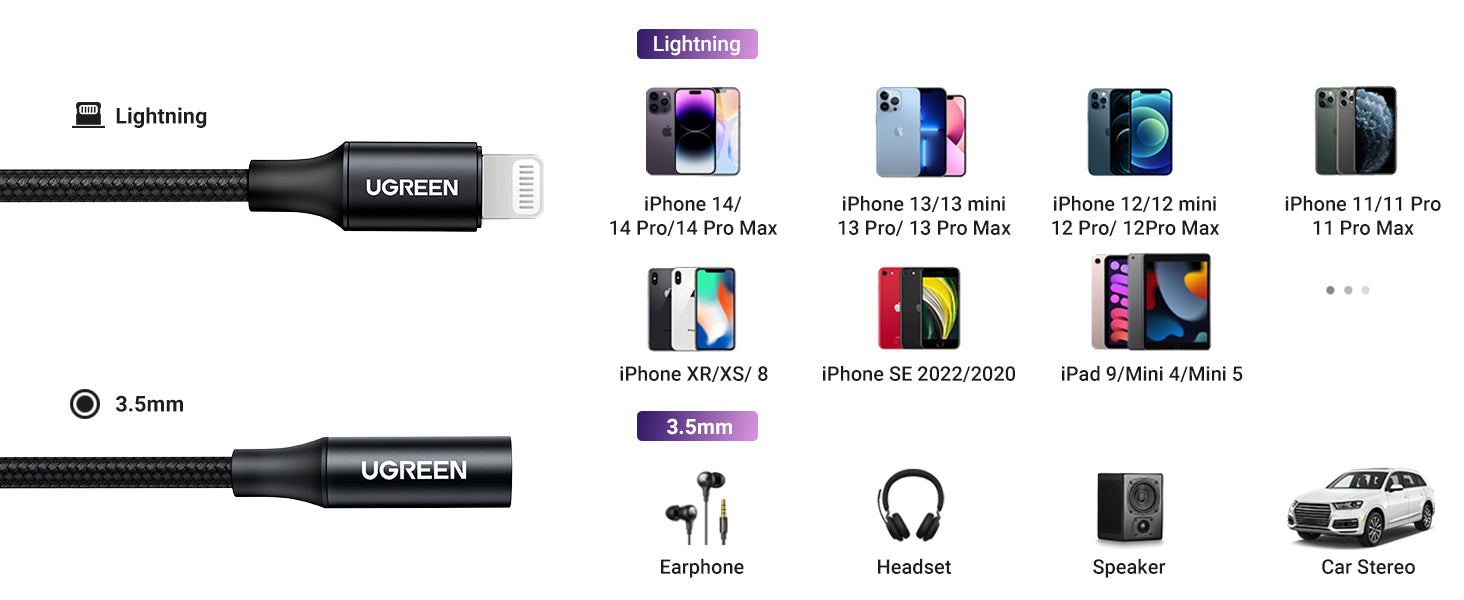 This adapter lets you connect devices that use a 3.5mm audio plug to your Lightning devices. Just plug the adapter in your device, let your Apple equipment recognize the adapter for 3-5 sec before playing music.