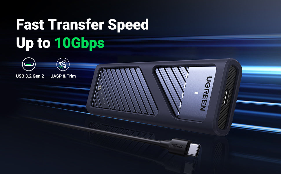 • This SSD enclosure features the latest USB 3.2 Gen 2 and PCIe 3.0 (NVMe), which supports an amazing data transmission rate up to 10Gbps. It is faster enough to transfer 1GB of files in 1 second.