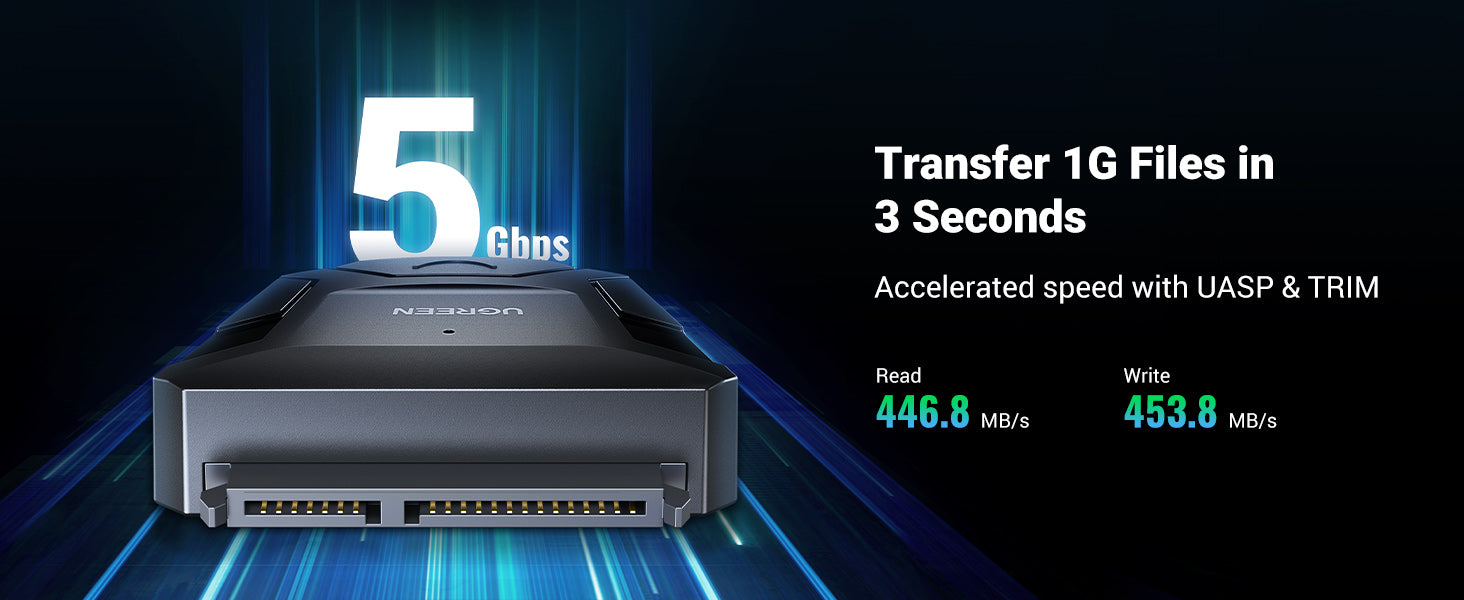 features latest SATA III 6Gbps internal and USB 3.0 5Gbps external and delivers blazing data transmission rate up to 5Gbps. Enhanced with accelerated transmission protocols-UASP (USB Attached SCSI Protocol) and TRIM, the SATA 3 USB Adapter enables you to take full advantage of SSD drives and realize 70% faster than traditional HDD drives.