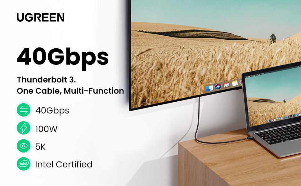 Ugreen Thunderbolt 3 cable (USB C TO USB C ) can support 40Gbps data transmission, 5K High-Resolution video output, and 100W power delivery charging, one cable meets all your needs.