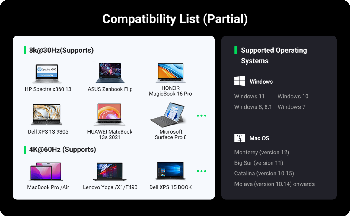 (3)Check whether the PC (Source device) supports 8K, theoretically, the PC equipped with Intel's 11th Gen CPU can support up to 8K, which includes:ASUS Zenbook Flip, Dell XPS 13 Laptop, HUAWEI MateBook 13s 2021, HONOR MagicBook 16 Pro, HP Victus 6/HP Spectre X 360 13