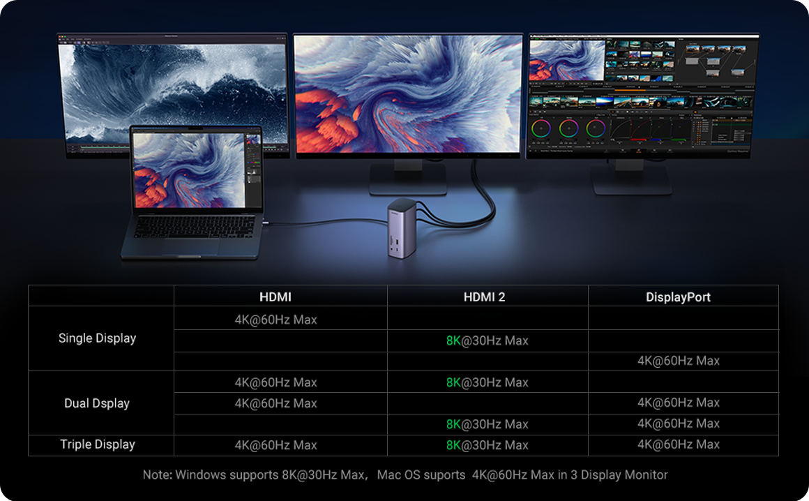 USB C docking station HDMI2 port supports up to 8K@30Hz in Windows, and up to 4K@60Hz in Mac OS.Connect via all three simultaneously to enjoy crystal-clear streaming or mirroring across 3 displays.
