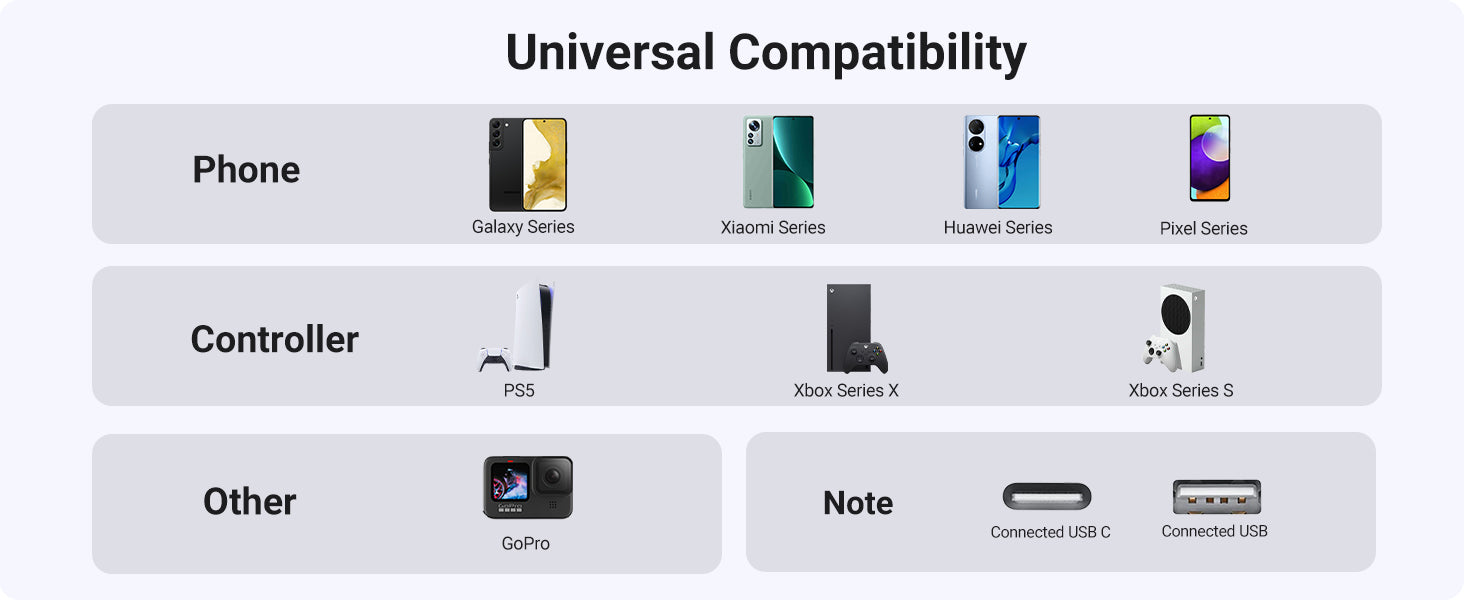| Compatible Devices | "For ALL devices powered by USB C like Samsung Galaxy S21/S20/S10/S9/S8,Samsung Galaxy Z Flip 3/Z Fold 3, Note 20/Note 10/Note 9/Note 8, A20/A10e /A51/A50/A70/A71/A80;LG G5/G6/G7/V20/V30/V40/V50, Stylo 4/5; Google Pixel XL/2/2XL/3/3XL/3a/3aXL/4/4XL;Moto Z Force, Moto Z Play, Moto Z2 Force, Moto Z2 Play; Nexus 5X 6P, HTC 10 U11, Lumia 950 950XL;Huawei P9 / P9 Plus, Mate 9 Mate 10;iPad Air 4 iPad Mini 6;iPad Pro 11"" 12.9"" 2020/2018;Nokia N1 Tablet, Samsung Galaxy Tab S3;Nintendo Switch, GoPro Hero5 Black, DJI Osmo Pocket Handheld 3 Axis Gimbal Stabilizer with Integrated Camera, PS5 Controller and etcFor ALL devices powered by USB C | "